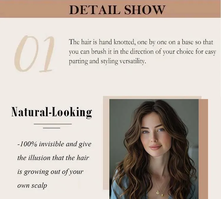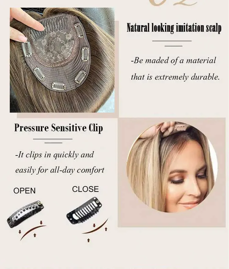 If you're dealing with thinning hair, grey strands, or overall poor hair quality on the top of your head, this product is perfect for you. It seamlessly integrates with your natural hair, ensuring that your friends or clients never discover your secret. The breathable mono base guarantees comfort, making it easy for you to wear on any occasion. Embrace your beauty and confidence – you deserve it!