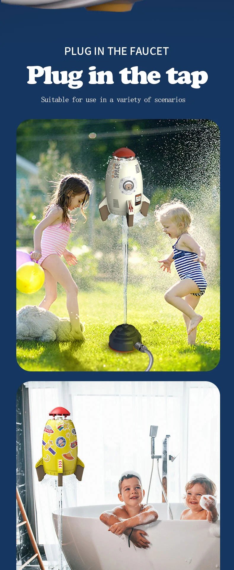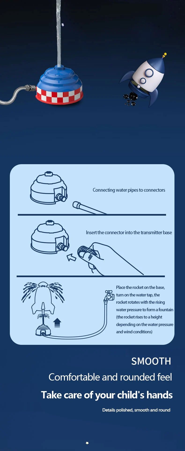 [Durable Material] The rocket sprinkler is made of Eco-friendly ABS material, safe and sturdy, durable and long lasting, perfect to bring your kids or pets a lot of fun in hot summer days.